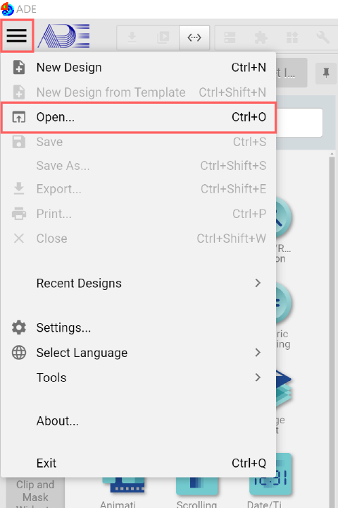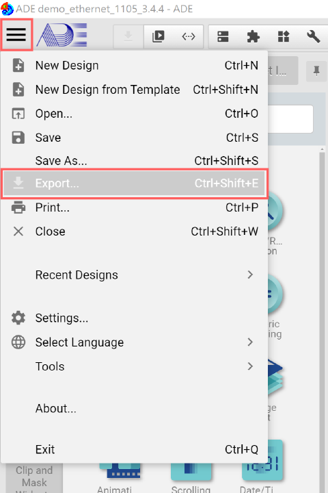 Click top left System Menu, select Open and click "ADE demo_ethernet.epgz" to open this demo project.