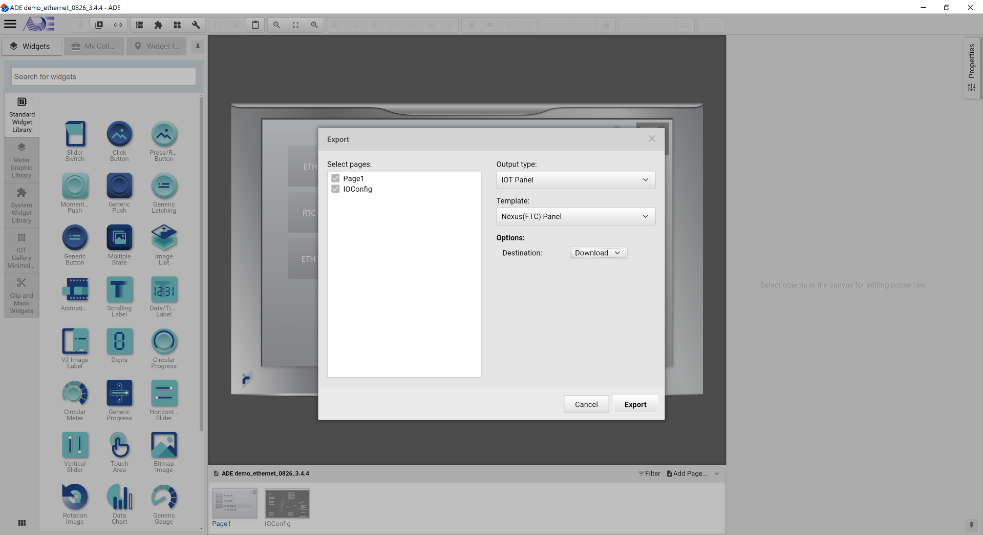 3. As shown, in the Export window, please select the Output Type to "IOT Panel", match the template to your target IOT panel and set Options to download. The click Export at the bottom.