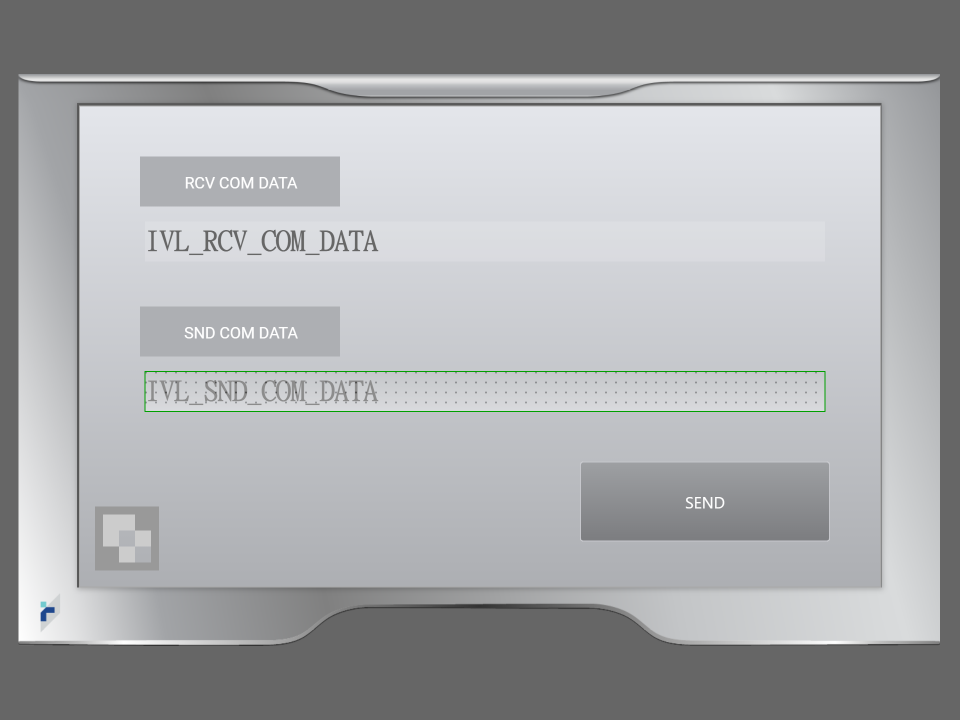 -SEND: Click event. Once clicked, com.send() transmits the data and the receive data is shown on IVL_RCV_COM_DATA