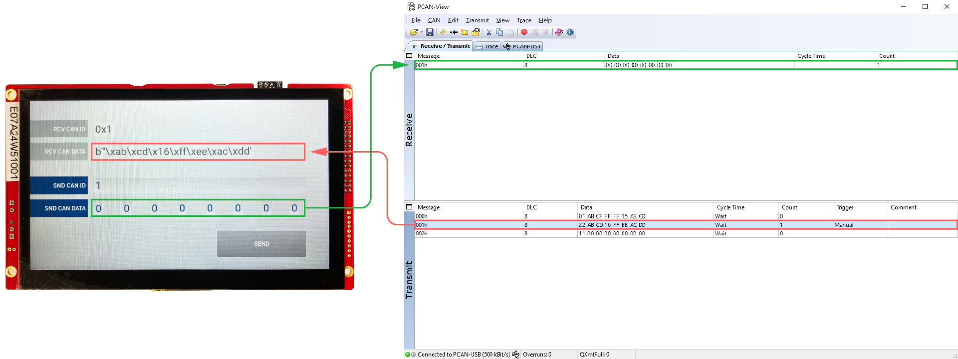 4. 於 ADE project 按下 "SEND" 來傳送資料,傳送的資料會顯示於 PCAN-View Receive 欄位上