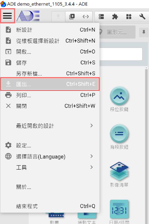 2. 開啟 ADE,於左上角之系統選單點擊「匯出...」